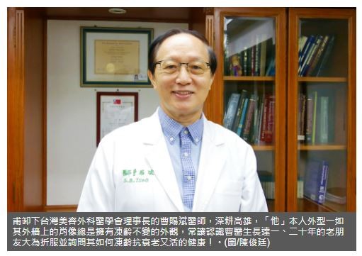 位在高雄市建國路的「曹賜斌整形外科診所」的外牆上,高掛著曹賜斌院長的肖像,「他」本人外型一如其外牆上的肖像總是擁有凍齡不變的外觀,常讓認識曹醫生長達一、二十年的老朋友大為折服並詢問其如何凍齡抗衰老又活的健康!台灣面臨「老齡化」的當前社會,如何抗衰老,讓自己能慢老又活得更健康,確實是一堂人生必要面對的學習課題。