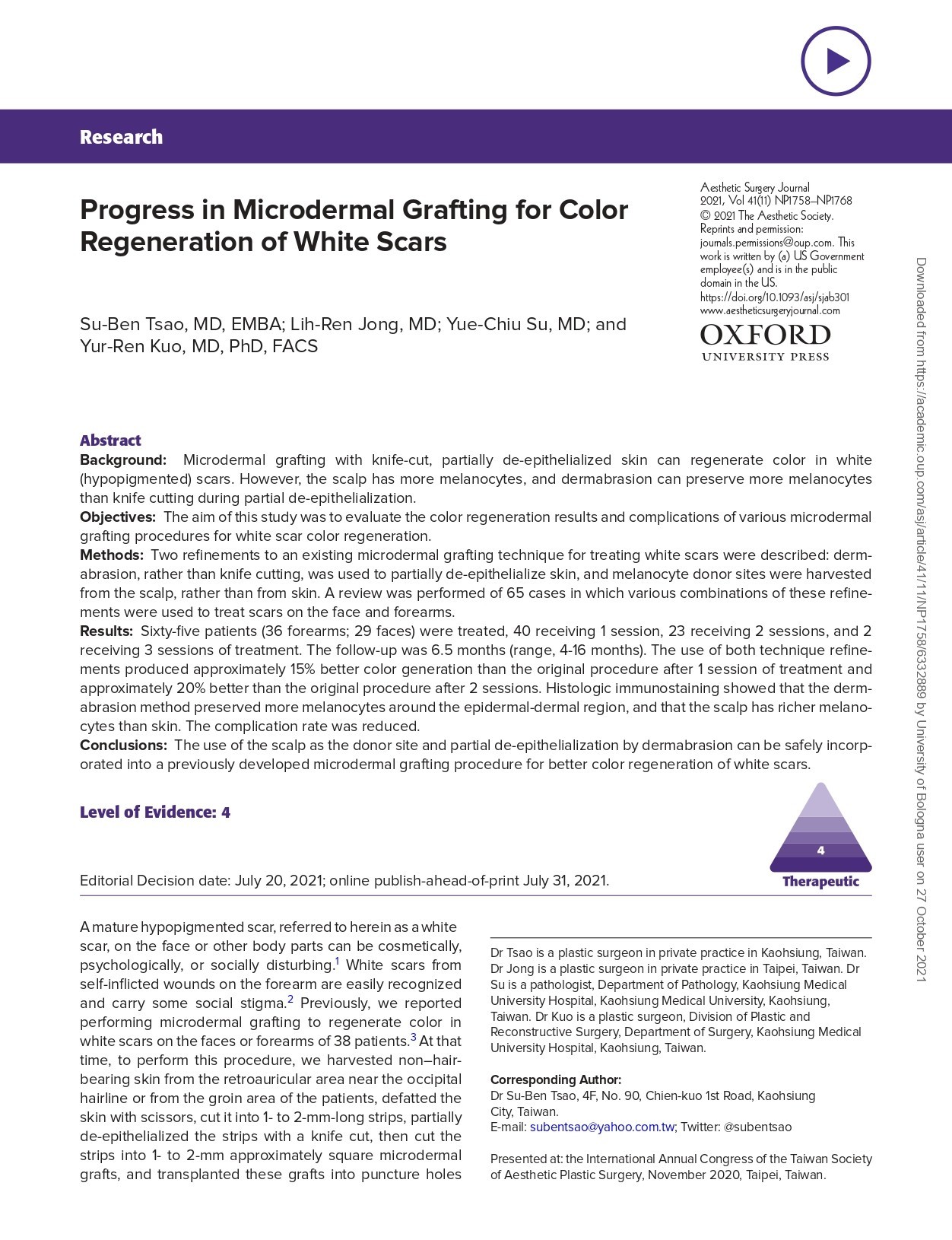 Progress in Microdermal Grafting for Color Regeneration of White Scars
